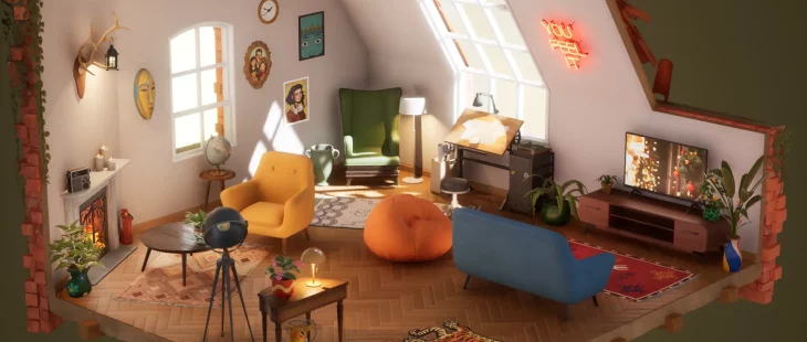 That said, I’d like to point out first that Hozy is a gorgeous game. Each space is a beautiful diorama where light plays realistically with shadow as you’re trying to perfectly line your sofa up with the wall. Whether it’s an artists studio complete with cute outdoor terrace, or a dark and brooding musicians home, each room is full of personality before you’ve even started adding the owners’ personal effects. It really makes a big difference to grounding you in these spaces, and seeing them cleaned and ready for decorating was very satisfying.