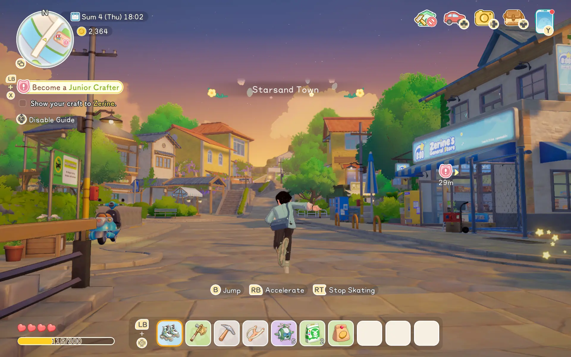 Did I mention the vehicles? Starsand Island is surprisingly big and you won’t want to be running everywhere on foot. From skateboards to motorcycles, there are a bunch of ways to get around and while buying your own vehicle might cost a fortune you can easily craft or rent them too. My preferred method of transport was rollerblades as I could keep them in my hotbar, but for longer journeys you’re better off renting a scooter or even a sporty motorbike. Controls can be a bit janky (you essentially control them as you would yourself while walking) but they make getting around a fair bit quicker.